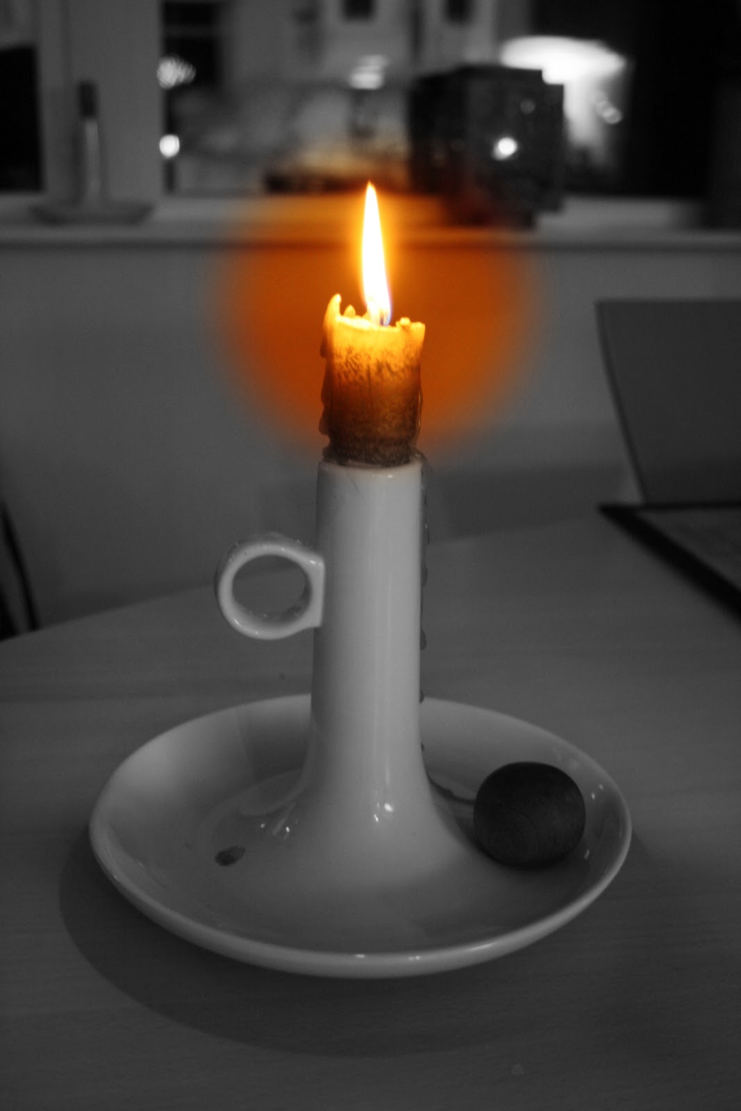 Det är ingen kastanjenöt i ljusstaken utan en slät mahognykula som O har gjort i slöjden.
