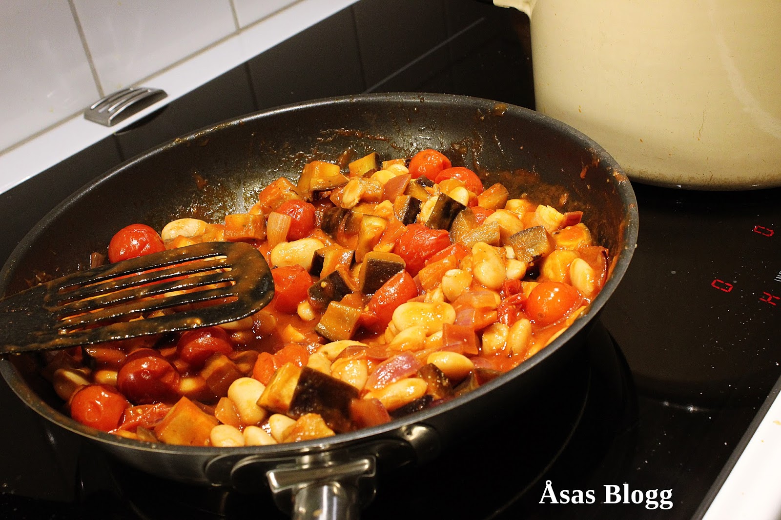 Stek aubergine och lök i olivoljan i en stekpanna, gärna teflon. Krydda med pressad vitlök, socker, salt och peppar. Tillsätt tomater, vatten och buljongtärning. Låt puttra ca 5 minuter.